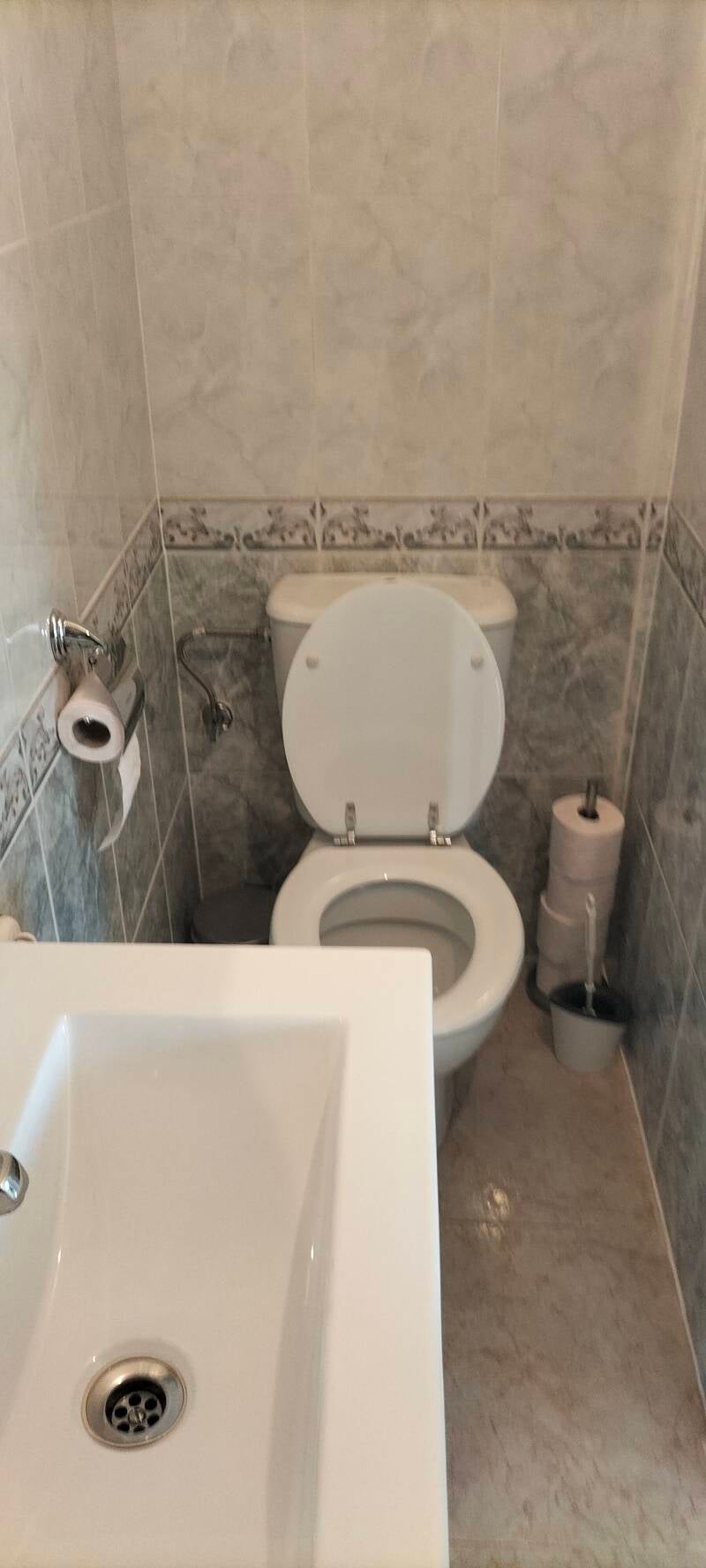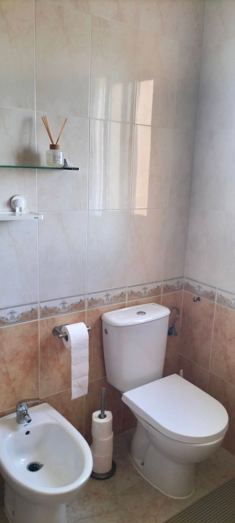 De badkamer is voorzien van een ligbad met douche, een wastafel, bidet en tweede toilet.
