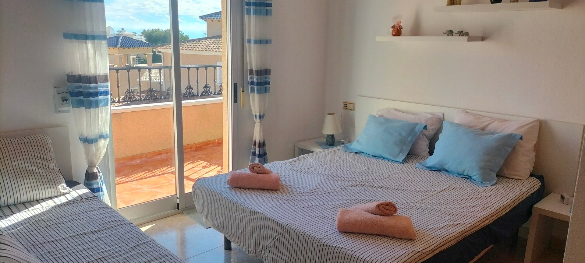 Op de eerste verdieping bevindt zich de master bedroom met een 2 persoons bed en een eenpersoons bed. Ook is hier een groot balkon waar U ’s morgens lekker van het zonnetje kunt genieten.