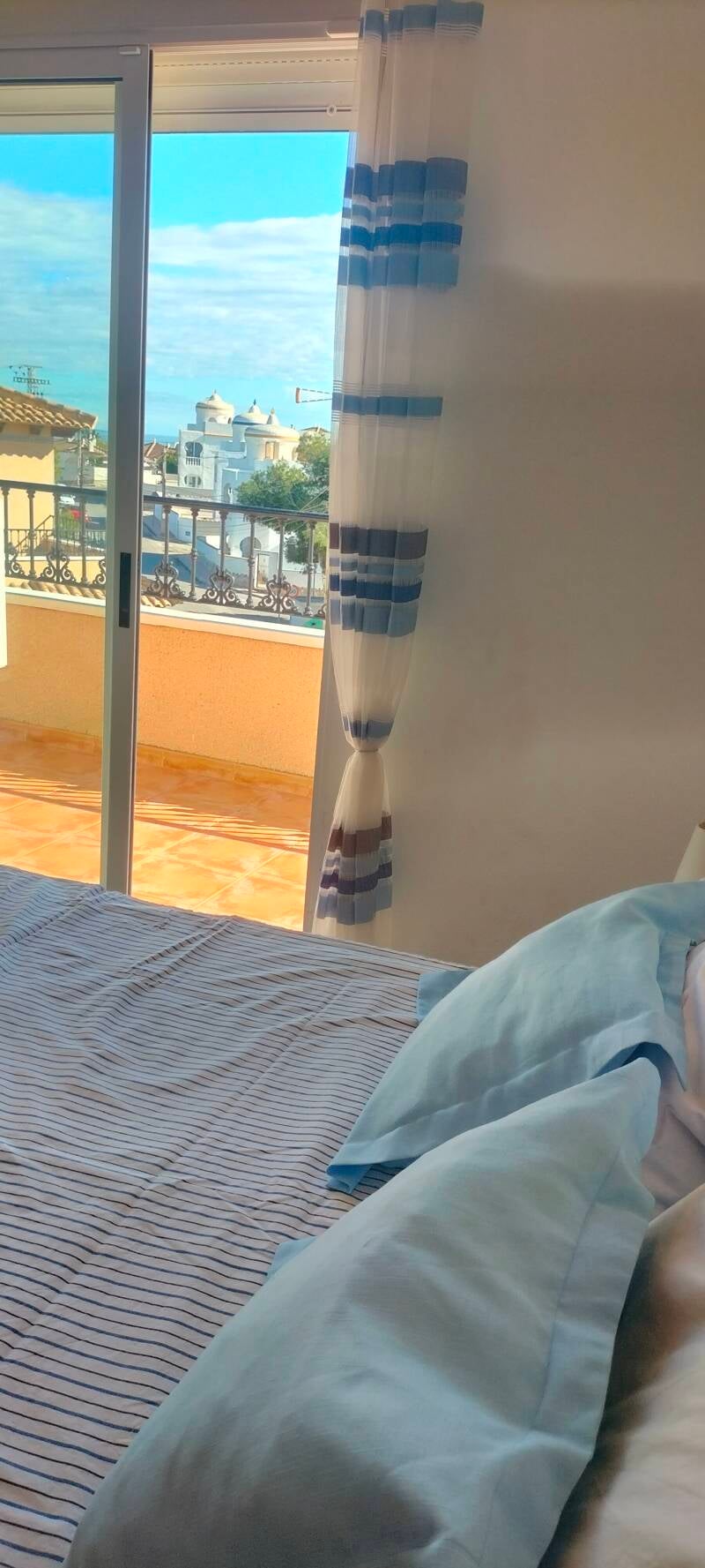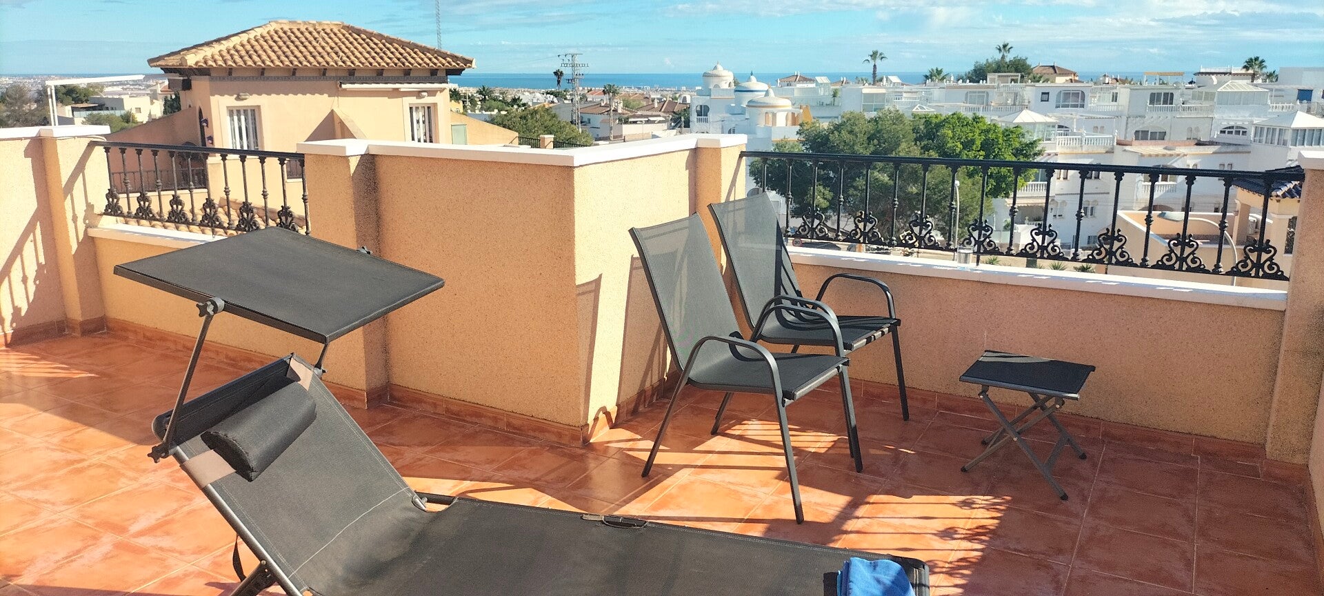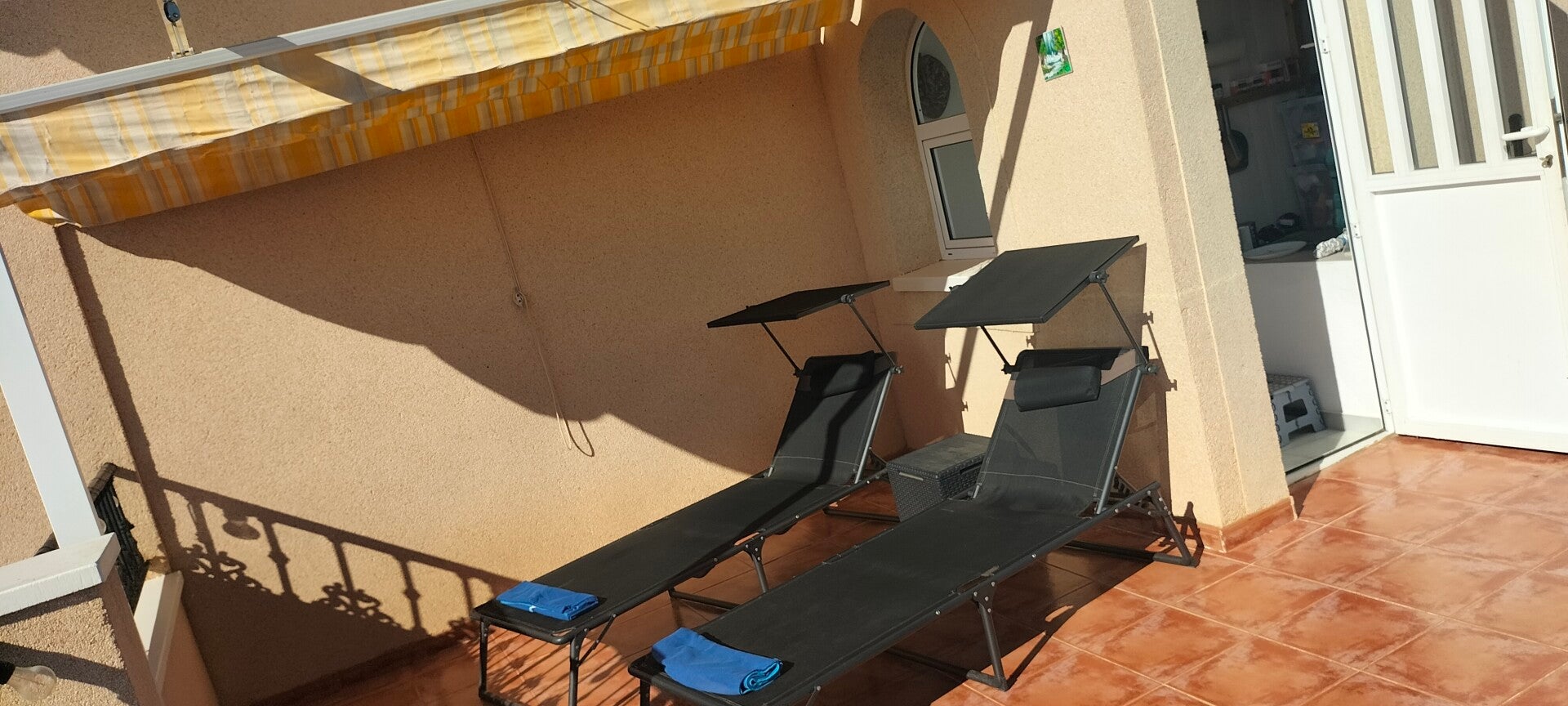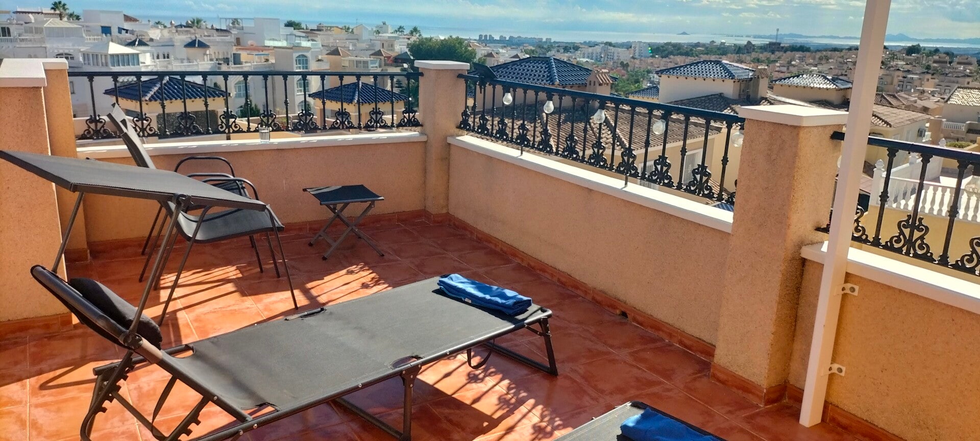 Dan is er op de bovenverdieping een mooi dakterras, dat uitzicht biedt op de zoutmeren van Torrevieja, de bergen in het achterland en vele kilometers kustlijn. Kortom een prachtig uitzicht met veel privacy. Hier kun je lekker de gehele dag genieten van de zon. Er zijn 2 ligbedden en enkele stoelen. Ook is hier een zonneluifel aanwezig.