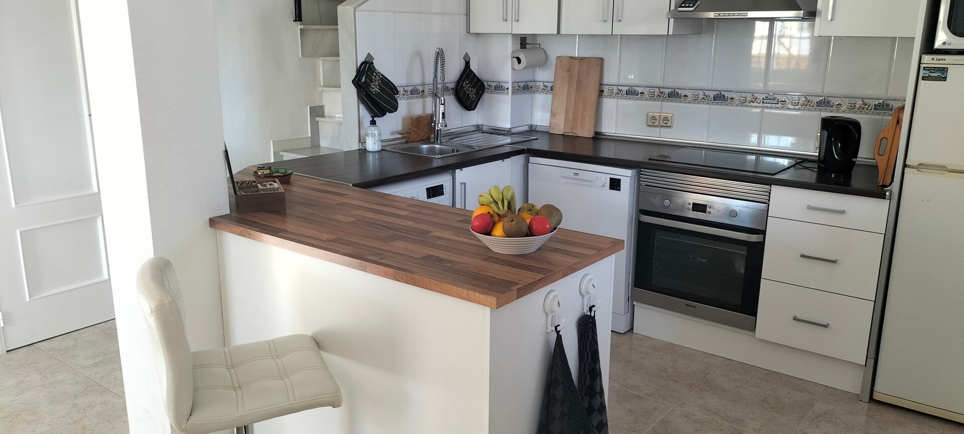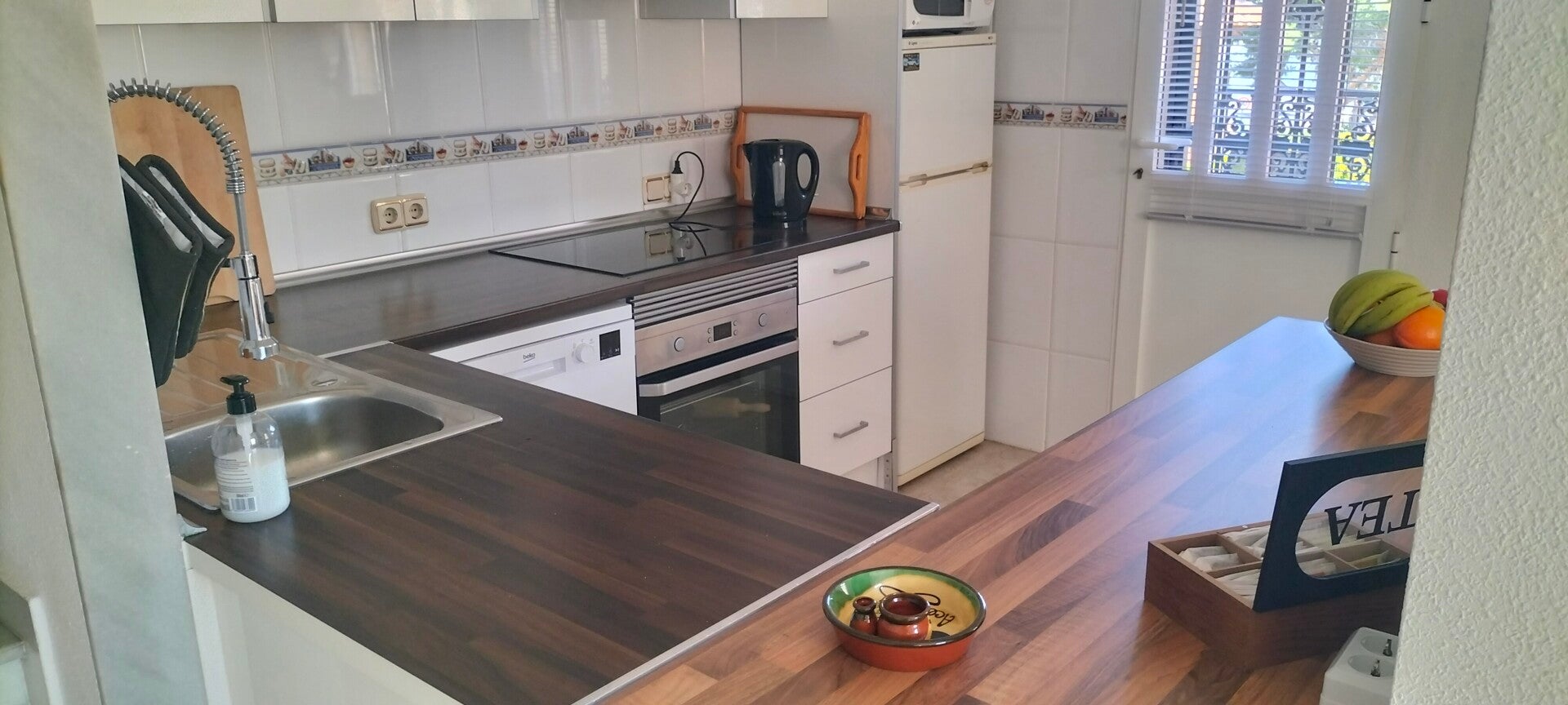 De moderne keuken bestaat uit koel/vries combinatie, wasmachine, koffiezetter, Nespresso, waterkoker, elektrische kookplaat, vaatwasser, magnetron, oven, broodrooster, airfryer en tosti-ijzer.